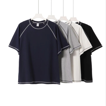 American Retro 260G doble hilo algodón contraste Color línea cuello Simple suelta estilo Casual moda hombres camiseta